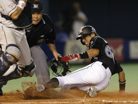 2死から西岡、今江、井口の3連打で同点に追いつきました! 2死からでも得点を取れる打線のつながりはこの試合でも健在です! |