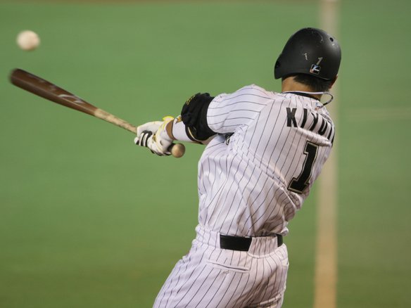 2番 清田 二ゴ 2-3からの6球目、1塁ランナー・西岡がスタート。インコース高めのフォークボールを止めたバットでなんとか当てた打球は、セカンド・高須の前に転がり、拾い上げた高須は1塁へ送球。しかし、西岡を2塁に進める進塁打になった!! |