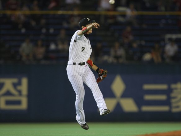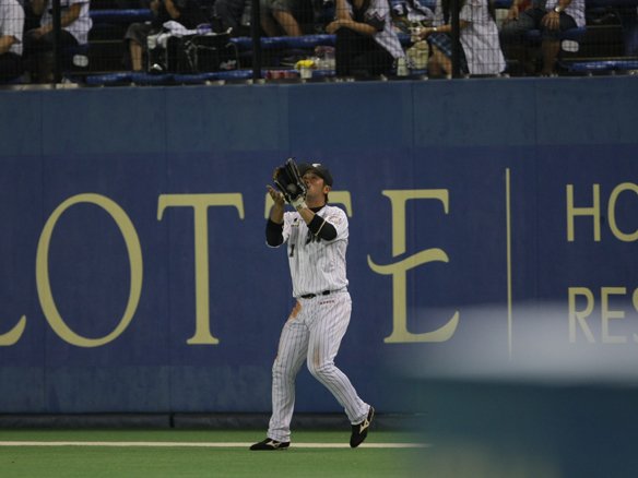 6番 中村紀 一直 2-2からの5球目、アウトコース高めのストレートを1塁線に弾き返された鋭い打球は、ファースト・金泰均がジャンプ一番、ミットの先で捕球!! さらに1塁を踏んで、飛び出している1塁ランナー・ルイーズもアウト。ダブルプレーに仕留めるファインプレー!! |