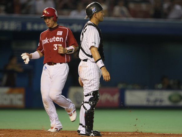 投手 岩隈 4番 金泰均 遊ゴ 初球、真ん中高めのストレートを打ち返した打球は、センター前に抜ける寸前にショート・内村に捕球されて、1塁へと送球されてしまった。 |