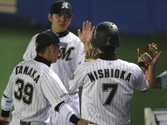 西岡が先制のホームを踏むとベンチの士気が上がる!