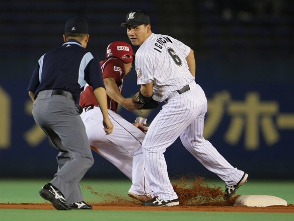 タッチアウトに仕留めた井口は1塁へ鋭い眼差しを送る
