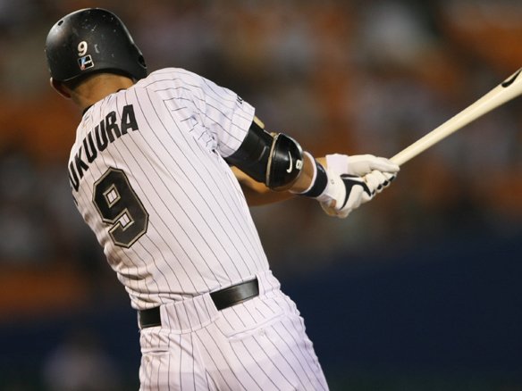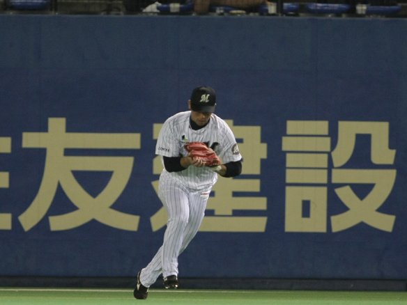 6番 中村紀 右飛 2-1からの4球目、アウトコース高めのストレートを逆方向に弾き返された打球は、ライト・清田が素早く前進して落下点に入った!! |