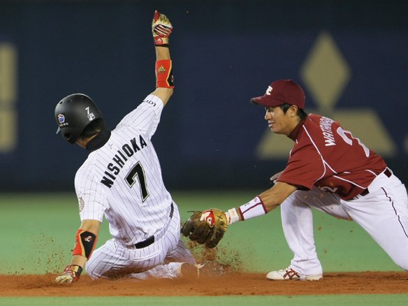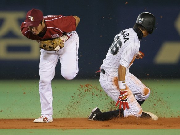 2番 清田 空三振 初球、1塁ランナー・西岡がスタート。キャッチャー・嶋からの送球を鋭いスライディングでかいくぐって盗塁成功!! |