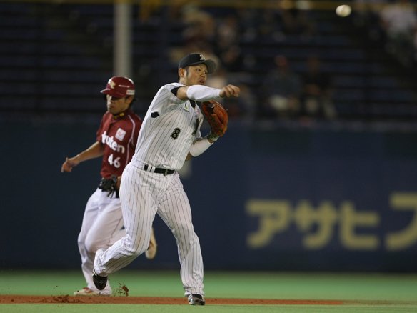 3番 井口 遊ゴ 0-1からアウトコースのカットボールを引っ掛けてしまった打球は、ショート・渡辺直が捕球して2塁へ送球。1塁ランナー・西岡はフォースアウト。1塁へは送球されず、井口は1塁に残り、2塁ランナー・岡田は3塁へ進んだ。 |