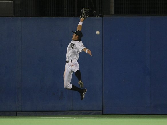 4番 山崎 二邪飛 2-2からの9球目、アウトコース高めのストレートをバットの先で高々と打ち上げさせた打球は、素早く追いかけるセカンド・井口がライト線を越えた地点で構え、しっかりとつかんだ!! |