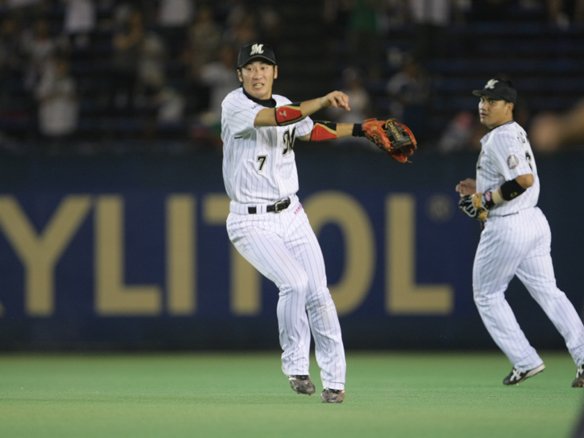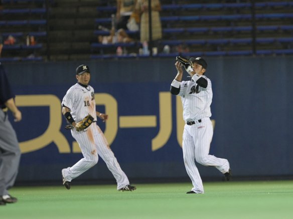 川越は先頭の糸井に2ベースヒットを打たれましたが、今江の落ち着いた守備もあって後続を打ち取りました! 6回にタイムリーを放った5番・福浦から始まる攻撃で一気に猛攻を仕掛け、劇的なサヨナラ勝ちを狙いたいところです! |
