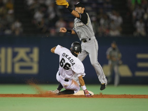 1番 西岡 遊ゴ 初球、1塁ランナー・岡田がスタート。キャッチャー・大野が2塁に送球するが、スピードに乗ったスライディングで滑り込んだ! 盗塁成功! 岡田はこれで今季13個目の盗塁! |