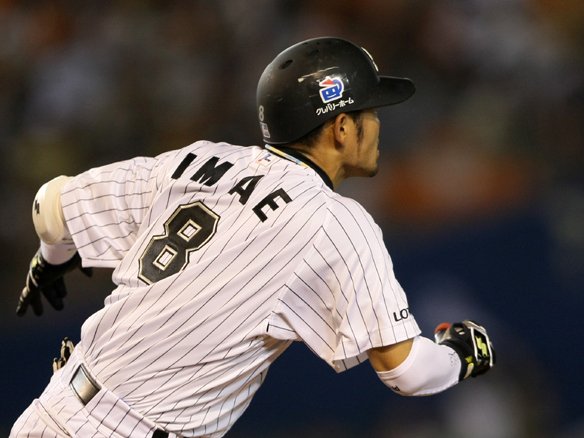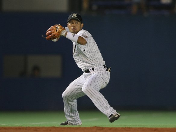 投手 吉見 1番 田中賢 中安 初球、インコース真ん中のストレートを振り抜かれ、鋭いライナーとなった打球はセカンド・井口が横っ跳びしたが、グラブを弾いてセンター前に抜けていった。 |