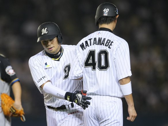 西岡、清田が出塁してチャンスを生み出すと、福浦が技ありのタイムリーを放ち1点を返しました! しぶとい攻撃でジワジワとファイターズに迫り、終盤の猛攻で一気に突き放したいところです! |