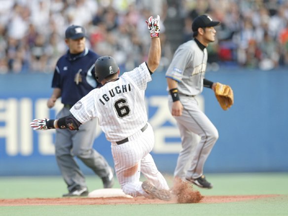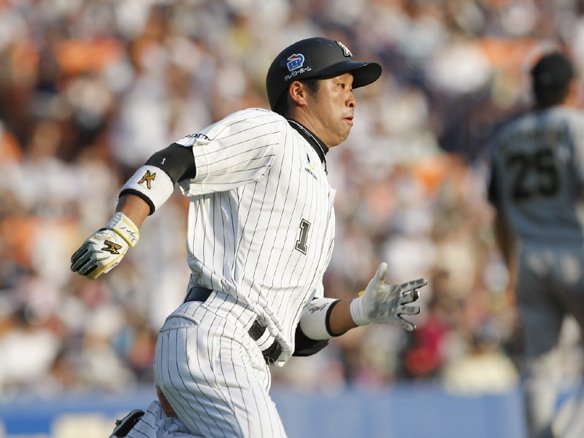 5番 糸井 左翼二 2-2からの5球目、アウトコース寄りのスライダーをコンパクトなスイングで三遊間に弾き返された打球は、レフト線方向に回り込むレフト・ムニスが拾い上げて素早く2塁へ送球したが、糸井は2塁に滑り込み、2ベースヒットになってしまった。 |