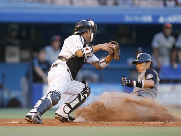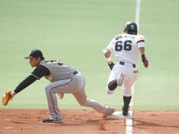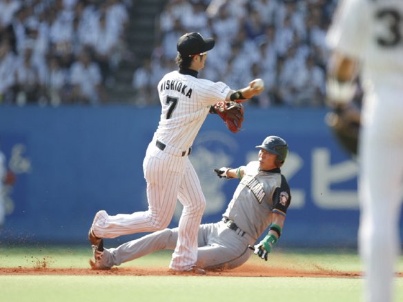 9番 根元 二ゴ 2-1からの5球目、アウトコース低めのフォークボールを引っ掛けた打球は、セカンド・田中賢の前に転がった。捕球した田中賢は1塁ランナー・的場にタッチしようとしたが、直前で的場がストップ。田中賢はタッチ出来ずに1塁へ送り、根元は打ち取られたが、再スタートを切った的場は頭脳プレーで2塁へ進んだ!! |