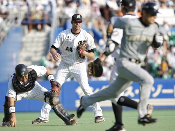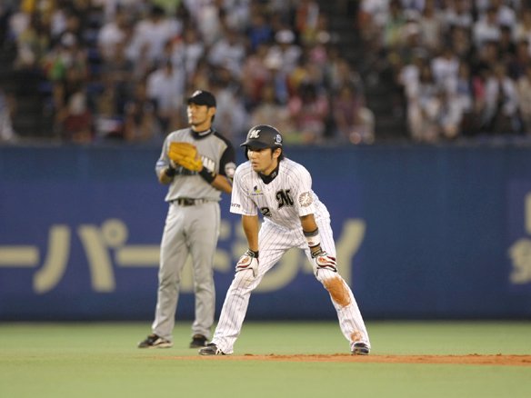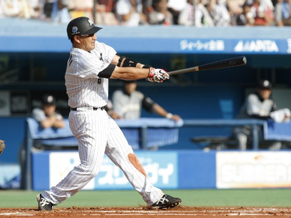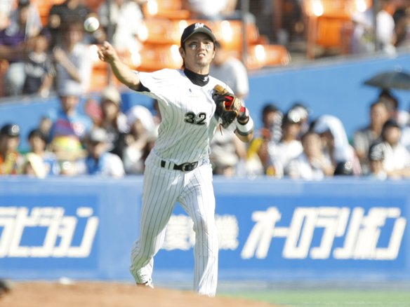 3番 井口 二飛失 2-1からアウトコースのスライダーにタイミングを外され、高々と打ち上げてしまった打球は、バックするセカンド・田中賢が足を止めた。しかし、風で流されて田中賢がグラブに収めきれず、ボールがグラウンドに転がった。井口はこの間に2塁へ。記録は田中賢のエラー。 |