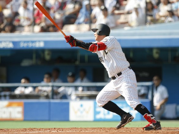 1番 田中賢 三ゴ 1-0からアウトコース高めのストレートを流し打ちされた打球は、サード・根元が低い体勢で拾い上げ、1塁へと送り届けた!! |