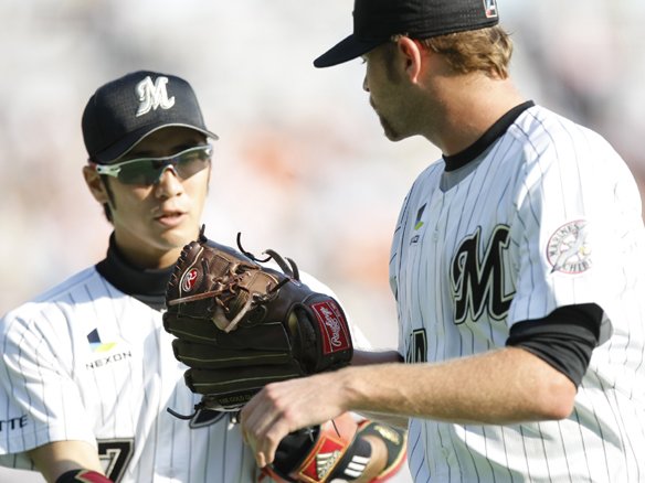 打ち取った打球が内野安打になり、悪い流れになりかけたこの回の守備でしたが、キャプテン・西岡の好守もあって3人で終わらせました。今日は内野の守備がカギを握りそうです。一球一球に集中して、ファイターズ打線を抑えていきましょう!! |