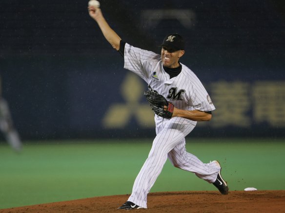 コーリーはランナー2,3塁の場面で4番・小久保というピンチを迎えましたが、落ち着いたピッチングで打ち取り無失点でしのぎました! 降り続ける雨にも負けず、粘り強く投げ続けています! |
