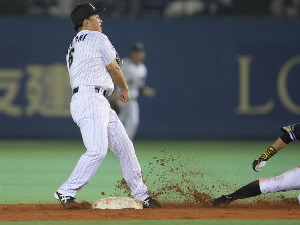 2番 本多 三ゴ 2-0からアウトコースのストレートを打たせた打球は、サード・今江の正面に転がった。今江は2塁ベースカバーに入ったセカンド・井口に送球。1塁ランナー・川崎がフォースアウト。井口は1塁へ転送するが判定はセーフ。 |