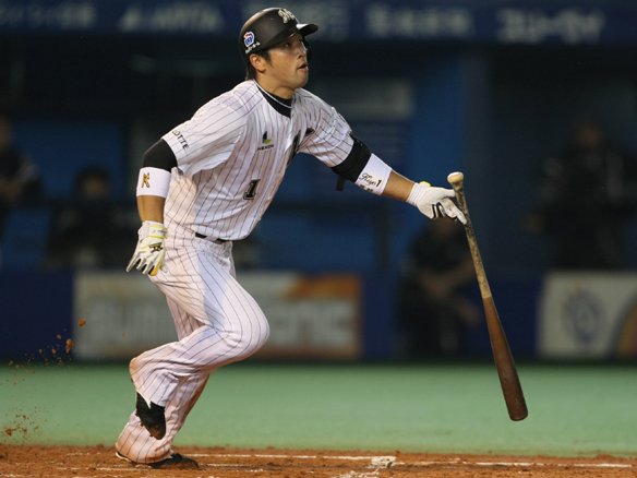 1番 西岡 右飛 1-1からアウトコースのストレートをうまくバットに乗せ、右中間に運んだ打球はライト・多村におさえられてしまった。 |