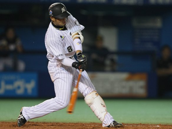 3番 井口 右安 2-0からアウトコース真ん中のストレートをバットの先でうまく運び、打球はライト・多村の前で大きく弾んだ! 1塁ランナー・清田は2塁を蹴って3塁にスライディング! |