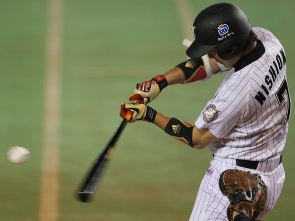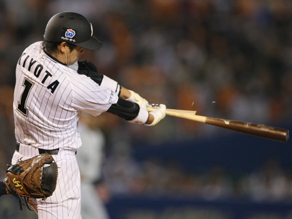 投手 長谷川 1番 西岡 一ゴ 1-2からアウトコース寄り高めのフォークボールを引っ掛けた打球は、ファースト・喜田剛におさえられて、自ら1塁を踏まれてしまった。 |
