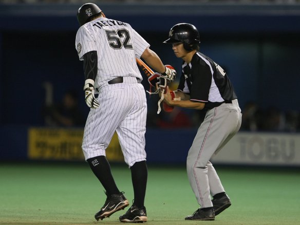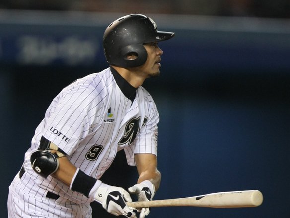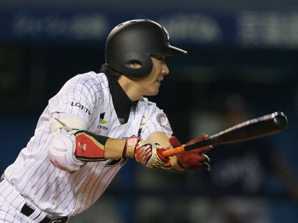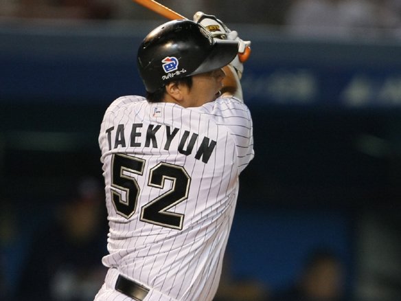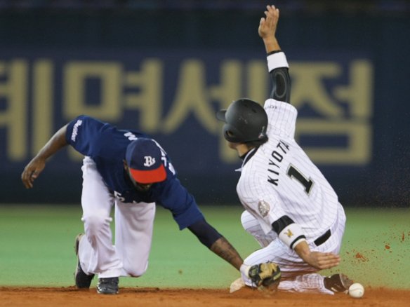 6番 バイナム 一ゴ 2-3から2球連続スライダーをカットされた後の8球目、アウトコース寄り低めのスライダーで泳がせた打球は、ファースト・金泰均の正面に転がり、捕球した金泰均は自ら1塁を踏んだ。しかし、2人のランナーはその間にそれぞれ進塁。 |