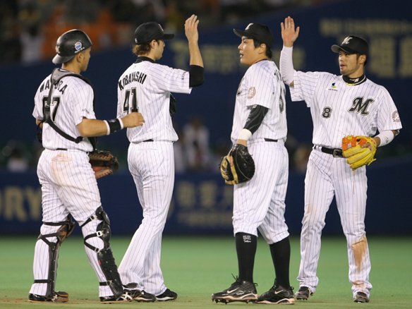 5番・今江がヒットを放ち、6番・福浦が送って作ったチャンスに、昨日から7番に入った金泰均がタイムリーヒットで応え、勝ち越しに成功しました!! 選手、そして千葉マリンに詰めかけた「26番目の戦士たち」が腕に巻くバンドの白い色は、勝利の星の色!! チーム一丸となって、クライマックスシリーズへと前進しましょう!! |