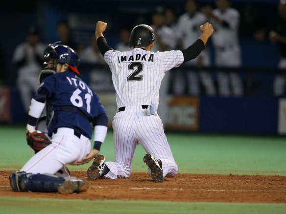 執念のヘッドスライディングで生還した今岡はこん身のガッツポーズ!