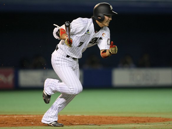 3番 井口 右安 初球、アウトコース高めのストレートを上から合わせるようなスイングで逆方向に弾き返した打球は、ライト・森山の前でワンバウンドするクリーンヒット!! |