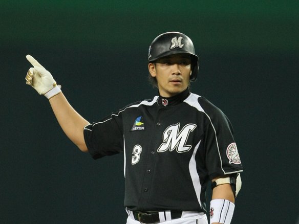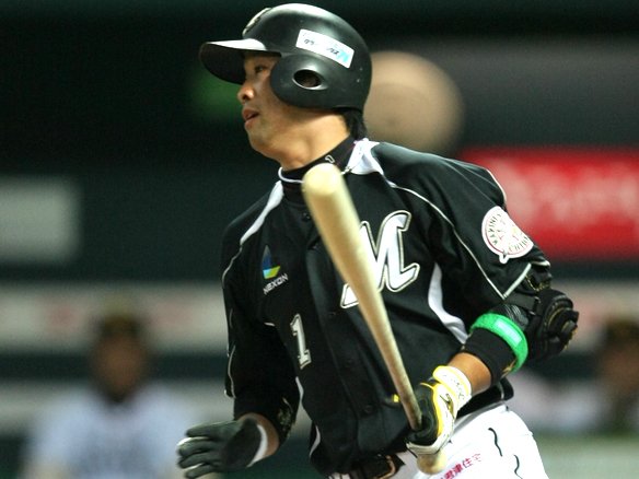 3番 井口 左安 1-3からの高めへのストレートを引っ張ると、打球はサード・松田の横を抜けレフト・松中の前へ飛んでいった! |