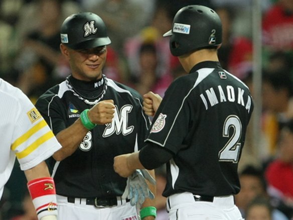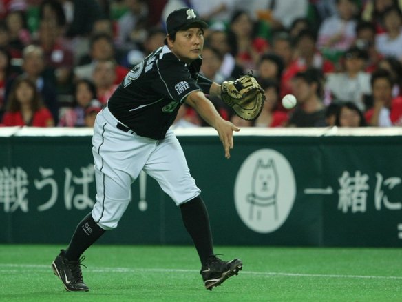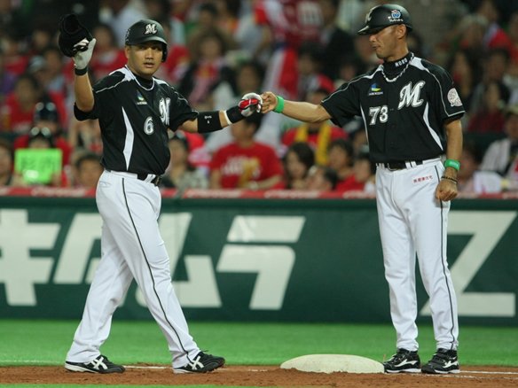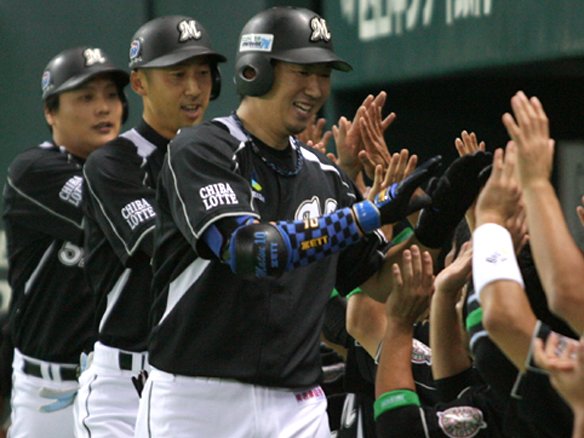 投手 金澤 4番 サブロー 中越二 初球の変化球を弾き返すと打球はグングン伸びてフェンス上部を直撃して上に高く跳ね上がり、グラウンドに戻ってきた。判定は2ベースヒットとなったが、これに対し審判で協議の上クライマックスシリーズでは初めてのビデオ判定に。その後判定は覆らず、結果は2ベースヒットのまま。 |