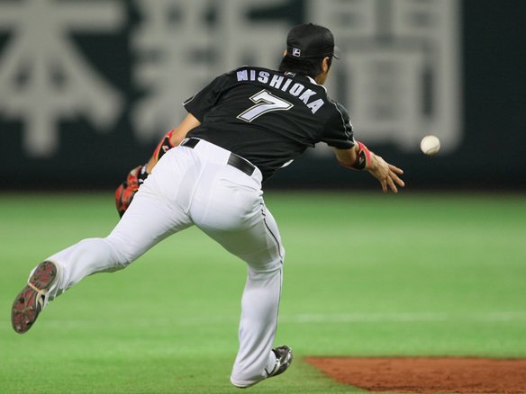 投手 成瀬 8番 松田 遊安 0-1からのインコース高めへのスライダーを弾き返されると、二遊間を抜けようかという打球にショート・西岡が追いついた。しかしボールを握りきれなかったために1塁に投げられず内野安打となった。 |