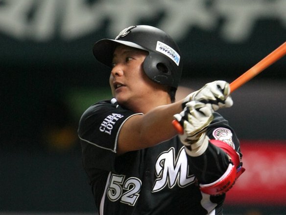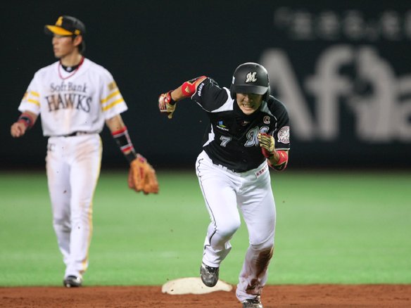 9番 清田 右中二 初球、アウトコース低めのスライダーを逆らわずに弾き返すと打球は右中間へ。ライト・多村が回りこんでこれをおさえる間に1塁ランナー・里崎は3塁へ進塁! 打った清田も2塁を陥れた! |