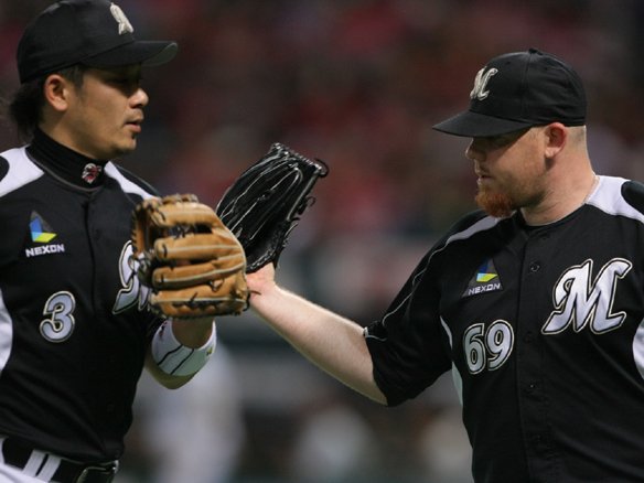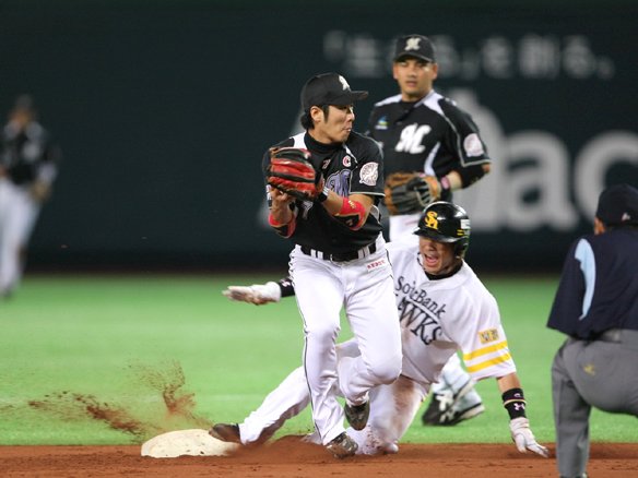 6番 里崎 遊ゴ 0-1からアウトコース低めのチェンジアップに詰まらされ、打球はショート・川崎の正面に転がるボテボテのゴロ。川崎はこれを2塁へ送球し、1塁ランナー・サブローはフォースアウト。しかし本多は1塁へ転送できず、ランナーが入れ替わる形となった。 |