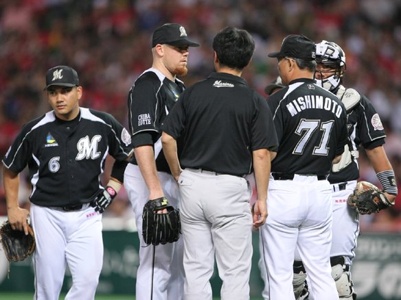 松中が治療のため一時試合が中断。すると、西岡がマウンドに駆け寄りマーフィーに声をかけます。 |