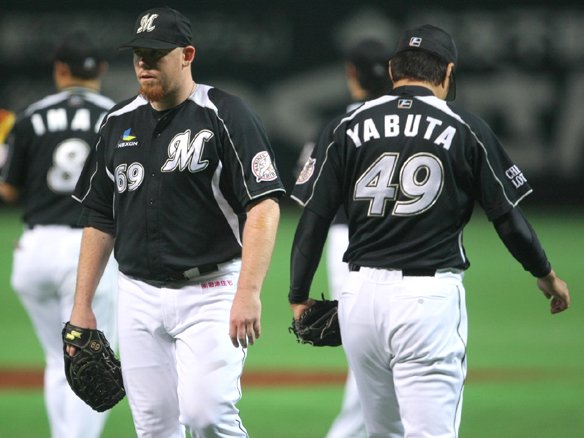 投手 ホールトン 4番 サブロー 捕邪飛 フルカウントから高めのストレートを打ち上げてしまい、高々と上がったフライをキャッチャー・山崎に左バッターボックス付近のファールグラウンドでつかまれた。 |