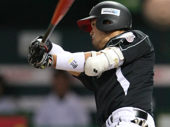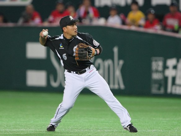 1番 西岡 左安 初球、アウトコース低めのカーブにうまく合わせ、スライスしていくライナー性の打球はレフト・松中の前で弾んだ! 西岡、待望のファイナルステージ初安打! |