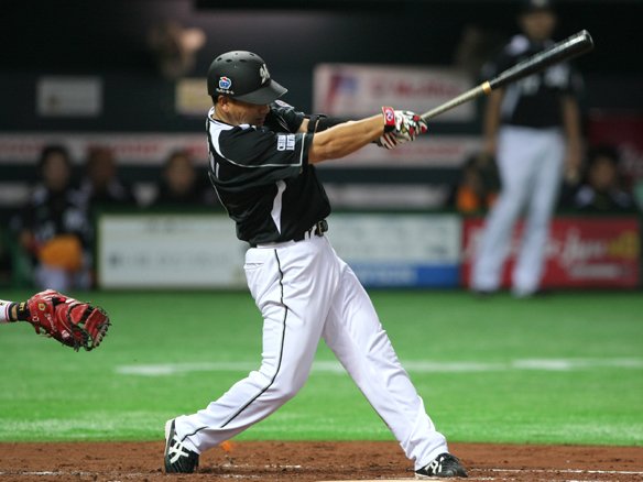 1番 西岡 左安 2-0からの4球目、インコースへのストレートを引っ張ると、打球は回りこもうとしたレフト・松中の前にポトリと落ちた! |