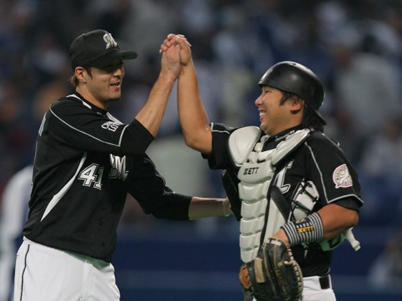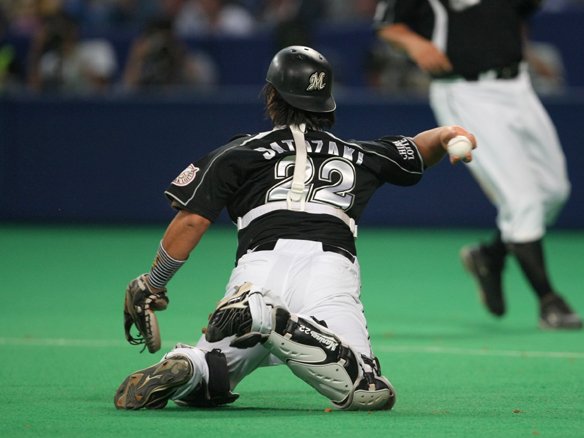 里崎が気迫あふれるプレーでチームを鼓舞!