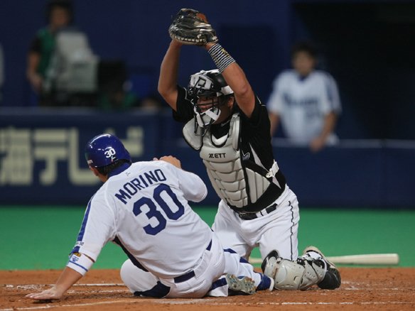 里崎は好ブロックで森野の本塁突入を阻む!