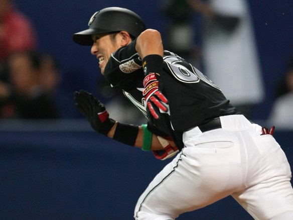 2番 井端 四球 1-1から1塁ランナー・荒木がスタート。キャッチャー・里崎が素早く送球するも、2塁ベースに入ったショート・西岡は荒木にタッチすることができず。盗塁成功。 |