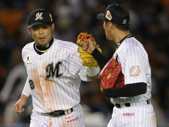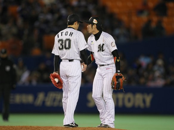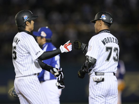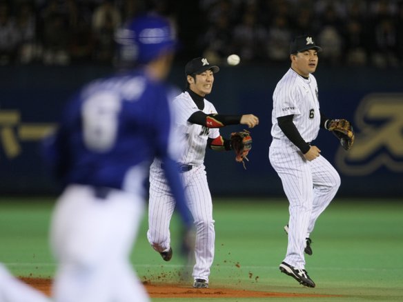 先頭の金泰均がヒットで出塁すると、里崎の送りバントなどでサヨナラのチャンスを演出。そして西岡の放った打球はサヨナラ勝ちを思わせましたが、惜しくもファール。結局サヨナラとはいきませんでした。しかし、確実に流れはこちらに来ているはずです! この日本シリーズでは初の延長戦となりますが、集中力を切らさずにいきましょう! |