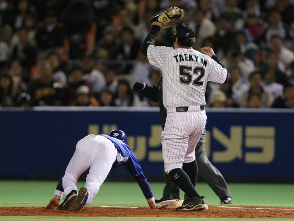 5番 ブランコ 三ゴ 初球を投じる直前、小野は1塁へけん制。ゆっくりと戻る1塁ランナー・和田に対しファースト・金泰均が素早くタッチしアウトに仕留めた。 |