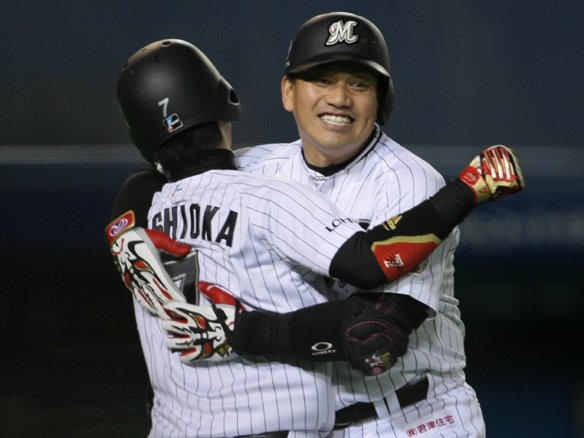 井口は2ランを放ち西岡と歓喜の抱擁!
