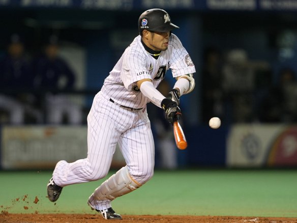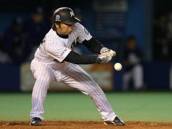 8番 里崎 投犠 初球、アウトコースのストレートを1塁線へしっかりと転がすとピッチャー・浅尾がこれを処理した。1塁ランナー・塀内は2塁へと進塁! 送りバント成功!! |