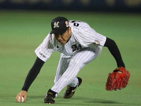9番 大島 二ゴ フルカウントからの9球目、アウトコース低めのスライダーを打たせると、高くバウンドしたゴロに対しセカンド・井口が素早くダッシュしこれを処理した。 |