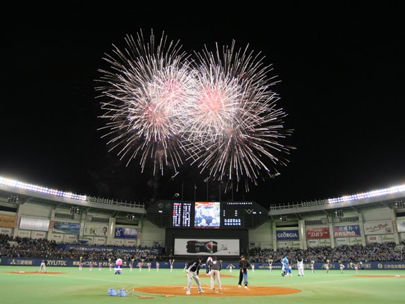 再びリードを奪っていきたいところでしたが、この回は3者凡退。そしてイニング終了後には選手達の士気を鼓舞するべく、花火が打ち上げられました! この花火のように打線を大爆発させていきたいところです!! |