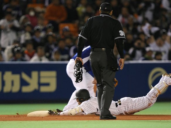1番 西岡 左翼二 初球、完全にすっぽ抜けたボールがバックネットに到達する間に1塁ランナー・岡田は2塁を陥れた。記録はワイルドピッチ。 ![]() 1