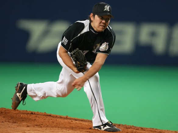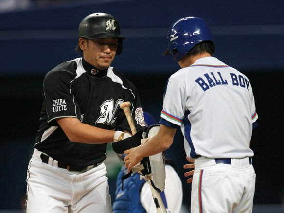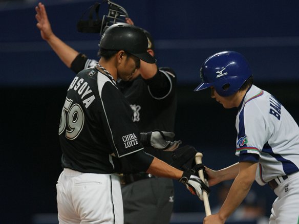 7番 里崎 投犠 0-1からバントの構えを見せてインコース高めのストレートを転がした打球は、ピッチャー・チェンが拾い上げて1塁へ送球。送りバントを成功させて、1塁ランナー・金泰均は2塁へ!! |