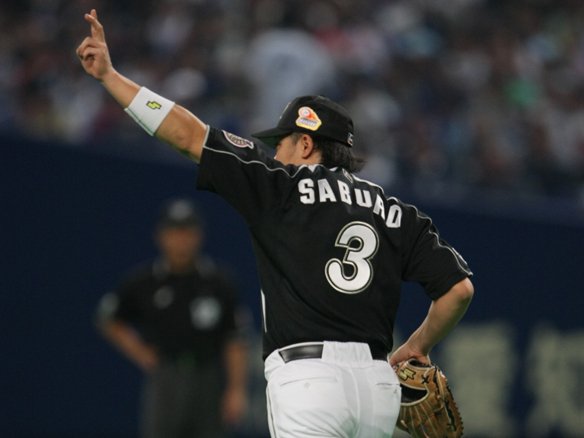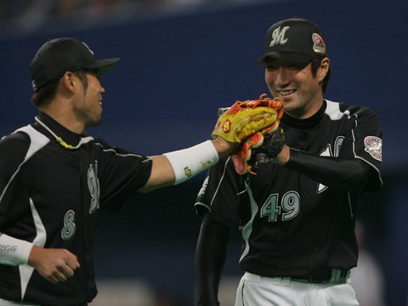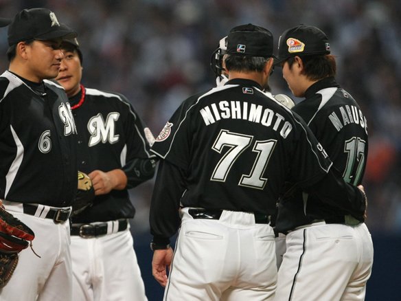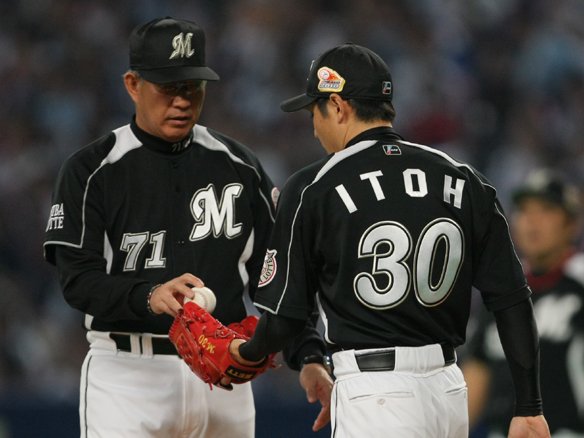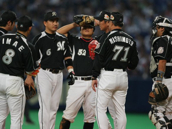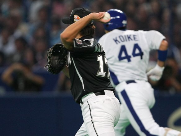 投手 チェン 投手 チェン・ウェイン 7番 里崎 遊ゴ 2-1から4球連続ファールで粘った後の8球目、アウトコースのフォークボールを三遊間に引っ張った打球は、横っ跳びしたショート・荒木に行く手を阻まれた。荒木は素早く立ち上がって1塁へと送球。 |