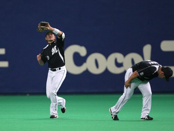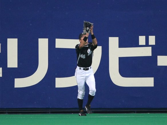 7番 里崎 中飛 1-1から真ん中低めのフォークボールをすくい上げた打球はセンター・大島の頭上を襲う飛球となったが、半身の体勢で左中間方向に追いかけ、一直線に落下点に入った大島が、グラブを伸ばしてキャッチ・・・。 |